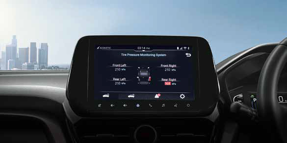The Tyre Pressure Monitoring System (TPMS) displays the individual tyre pressure on your Grand Vitara. It warns you in the e vent of a change in pressure thereby ensuring optimum riding comfort and increased safety on the road.